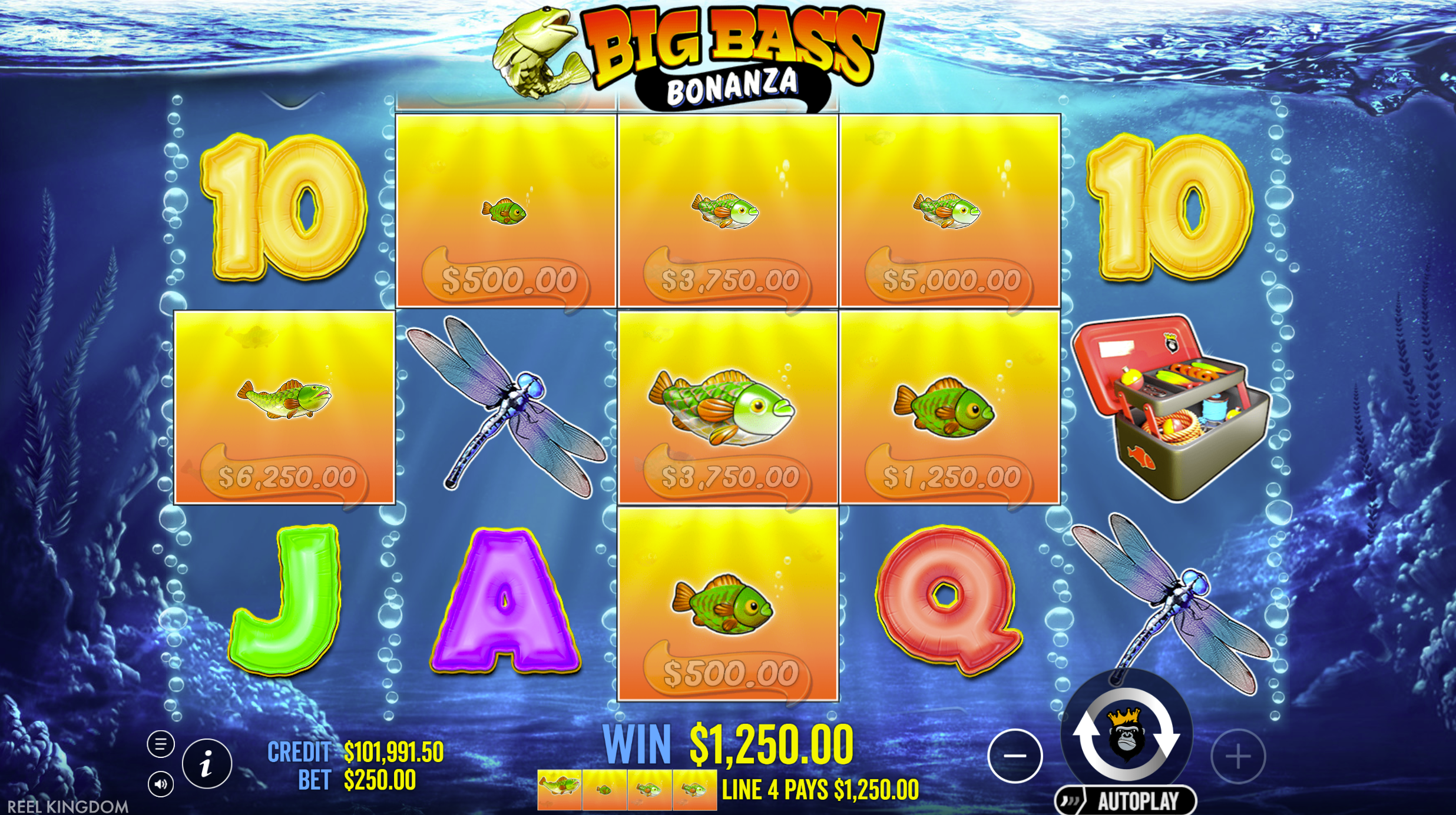 Landing scatter symbols triggers the free spins round. Money symbols that appear on the reels during both base and bonus play are collected and added to a total. During free spins, a Special Fisherman symbol can collect the accumulated value, multiplying the payout.